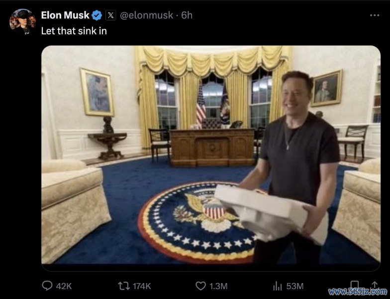 同时他也不忘再次玩梗,晒出了一张自己搬着洗手池走入白宫的合成图片并称“Let that sink in”。这个梗其实是马斯克入主推特后发布的庆祝推文,“Let that sink in”与中文网络梗“你品,你细细品”含义相近。