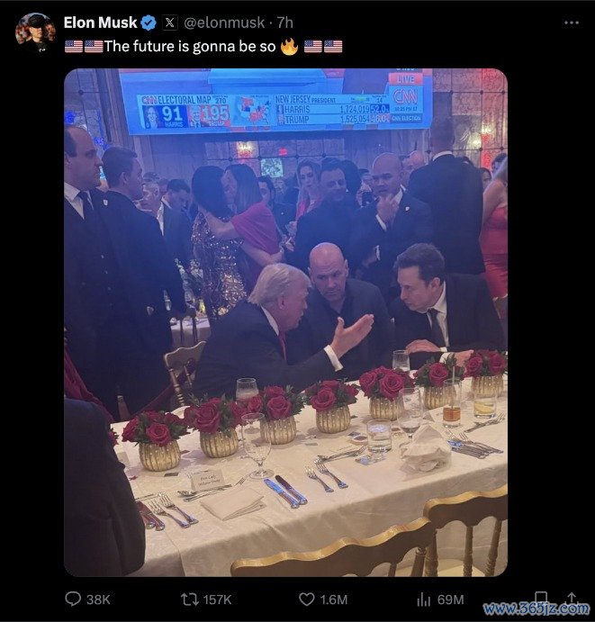 马斯克在X上分享的与特朗普在选举之夜派对上的合影